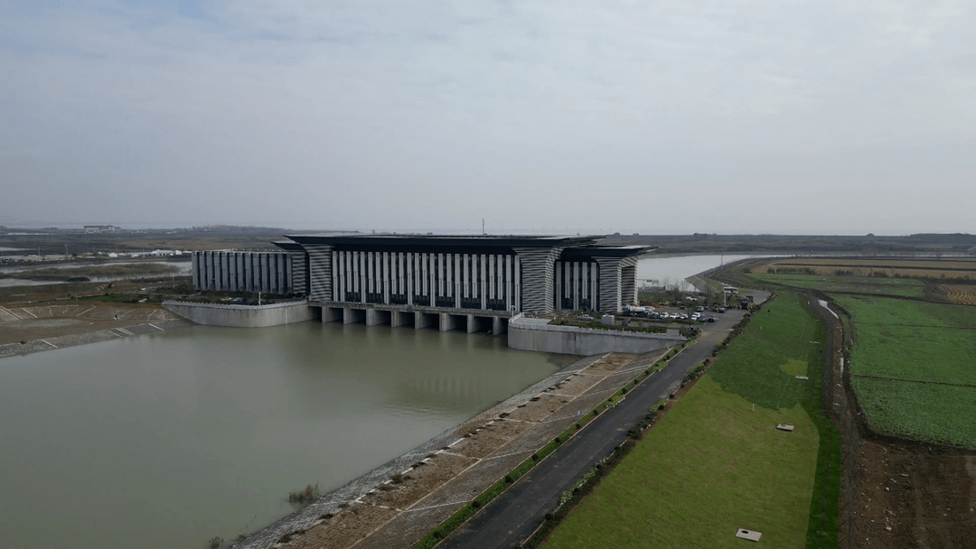 該工程位于肥西縣嚴(yán)店鎮(zhèn)蓮花村的派河口泵站,整體新中式造型,鋼琴鍵的外形,中國古建筑飛檐造型,具有騰飛之勢,同時(shí)建筑細(xì)節(jié)吸取音樂符號以及結(jié)合水紋波動的立面肌理,宛如跳動的樂章。